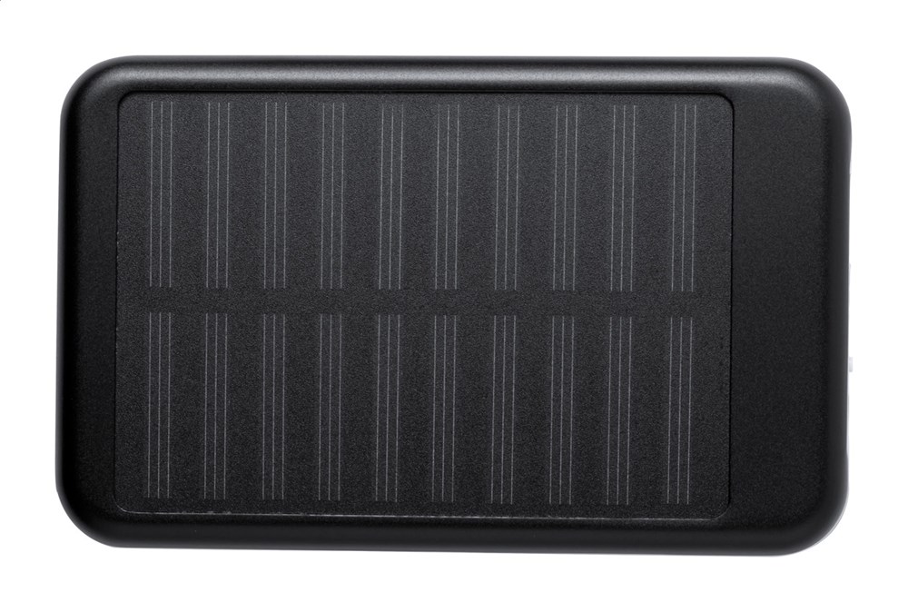 Powerbank aus Aluminium eingebautem Solar-Ladegerät. Akkukapazität: 4000 mAh. Inkl. USB-Ladekabel.